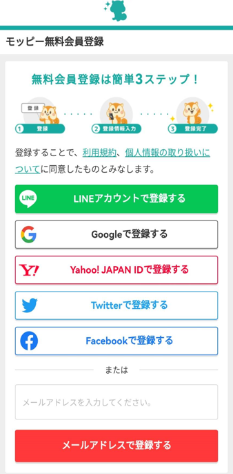 LINEやSNSのアカウントまたはメールアドレスで登録ができます。